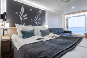 Ikkunallinen hytti kahdelle hengelle (160 cm leveä parivuode) 100 euroa/hlö kun hytissä majoittuu kaksi. Yksin majoittuvalle 120 €.