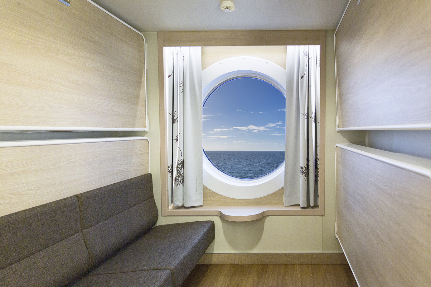 Ikkunallinen hytti kansilla 7,8 ja 9 kahdelle hengelle (160 cm leveä parivuode) + 150cm leveä vuodesohva 140 euroa/hlö kun hytissä majoittuu kaksi. Yksin majoittuvalle 180 €.